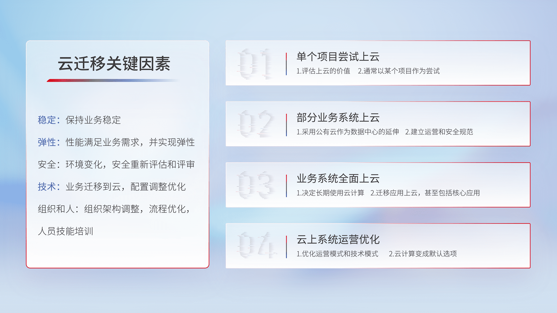 结合实际业务,,从规划设计、、、云平台选型、、、、云原生改造、、、数据迁移、、、集成交付,,,迁移全过程为客户识别最佳上云路径,,,做好风险识别管理,,设计网络架构、、、身份权限、、安全审计合规、、、操作审计、、日志审计、、、监控告警策略、、多站点容灾设计等,,对云上基础设施进行整体规划,,,提升IT治理水平,,,以满足弹性、、、高可用、、、高性能的需求。。