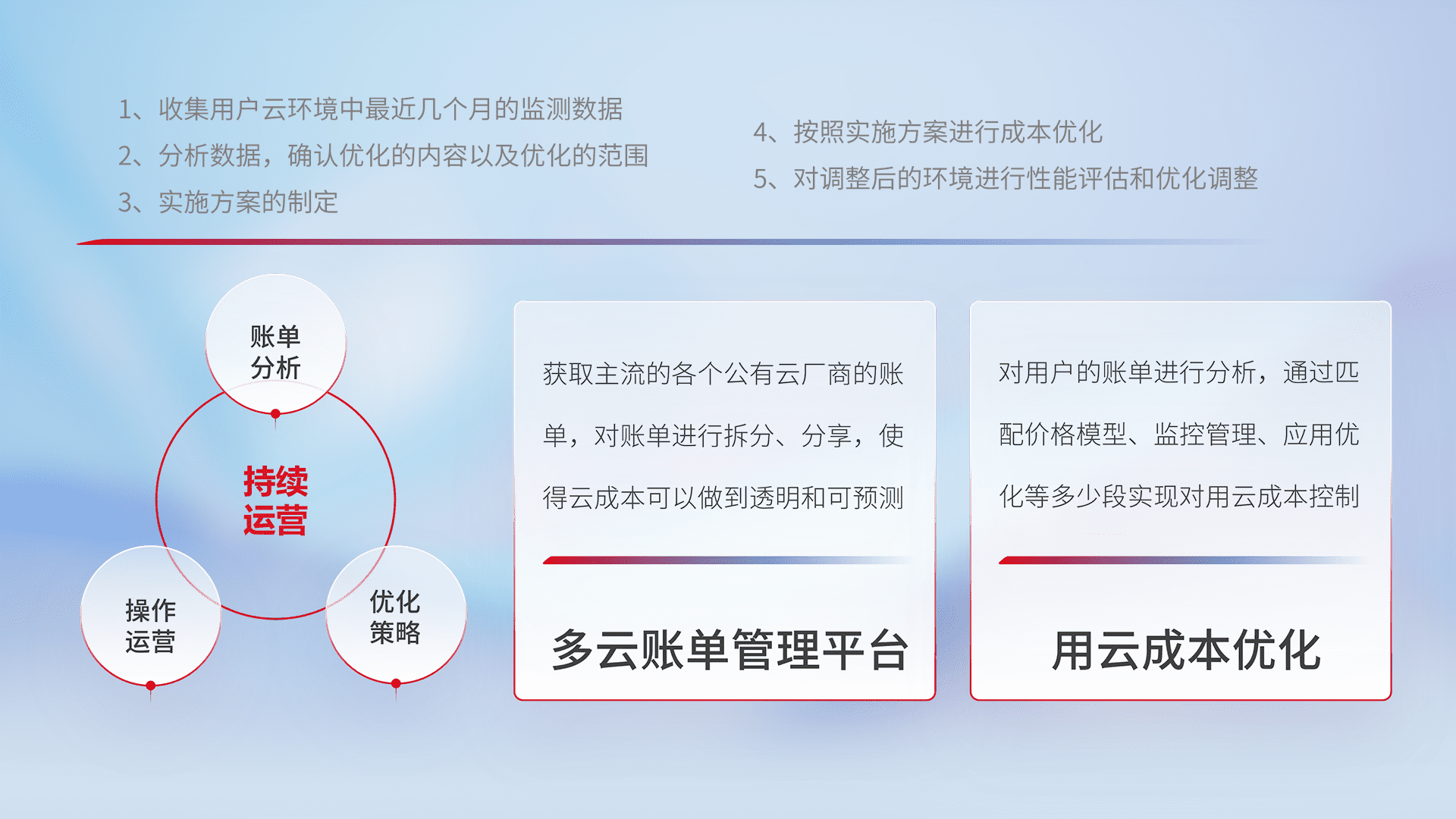 通过多云纳管,,以统一的资源数据模型把客户的云资源进行抽象和封装,,,,进而实现对多云资源的统一操作,,,,保障云资源管理的可靠性、、稳定性与可用性。。量身定制化运维内容,,,配置、、、、开发运维、、、、补丁管理、、、备份、、监控、、、、认证和访问管理、、、审计和日常巡检等,,,,保障在用云过程中的可靠度,,,稳定度以及高可用率。。。