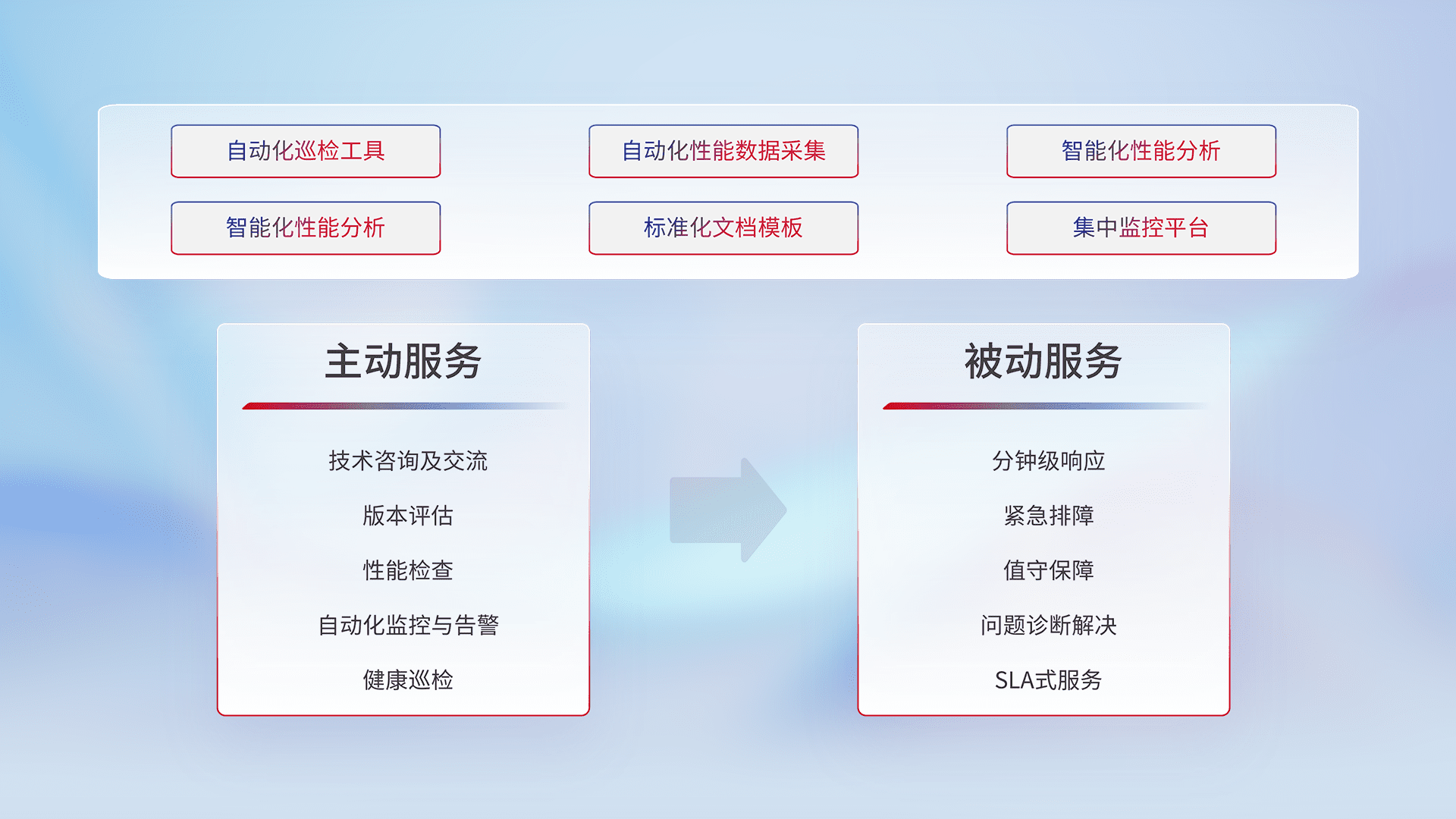 智能化工具和标准化文档,,保障服务质量,,,提供主动服务(包含技术咨询、、版本评估、、性能检查、、自动化监控与告警、、健康巡检)和被动服务包含(分钟级响应、、紧急排障、、、、值守保障、、、、问题诊断解决、、SLA服务)。。。