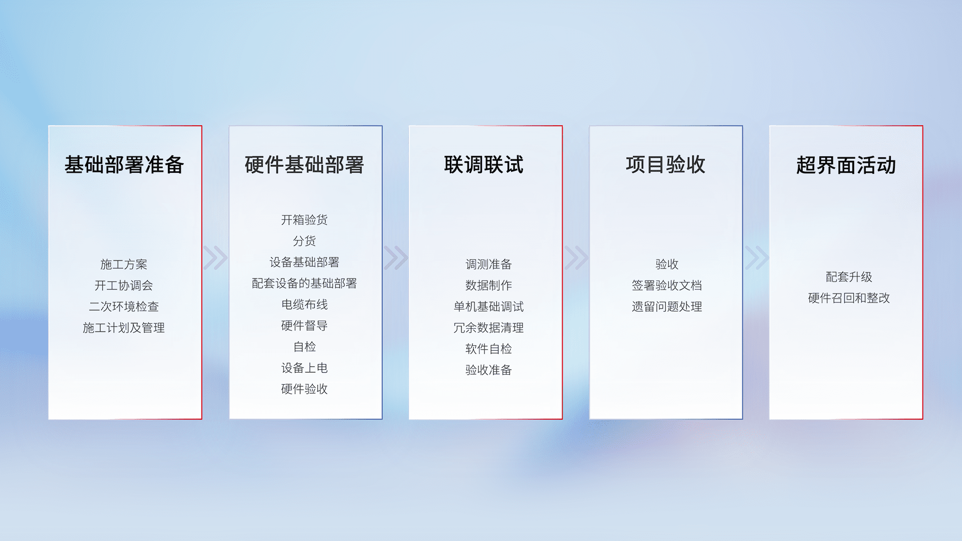 从基础部署准备、、硬件基础部署、、、联调联试、、、项目验收、、、越界面活动的全过程可追溯,,,,保证施工质量和进度。。。